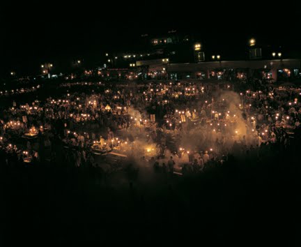 La piazza Jama'a el-Fnaa al centro di Marrakech è quello che io considero il villaggio globale, prima di Internet. In questa piazza da sempre si incontrano tutti coloro che vivono o passano da quella città. Il giorno è la sede di giocolieri, venditori di frutta e verdura, ammaestratori. La notte invece diventa un multi ristorante en plein air. Si trova di tutto, non solo cibi marocchini, ma tutto ciò che si trova nella cucina dell'Africa del Nord. Provare per credere. io sono sopravvissuto!!